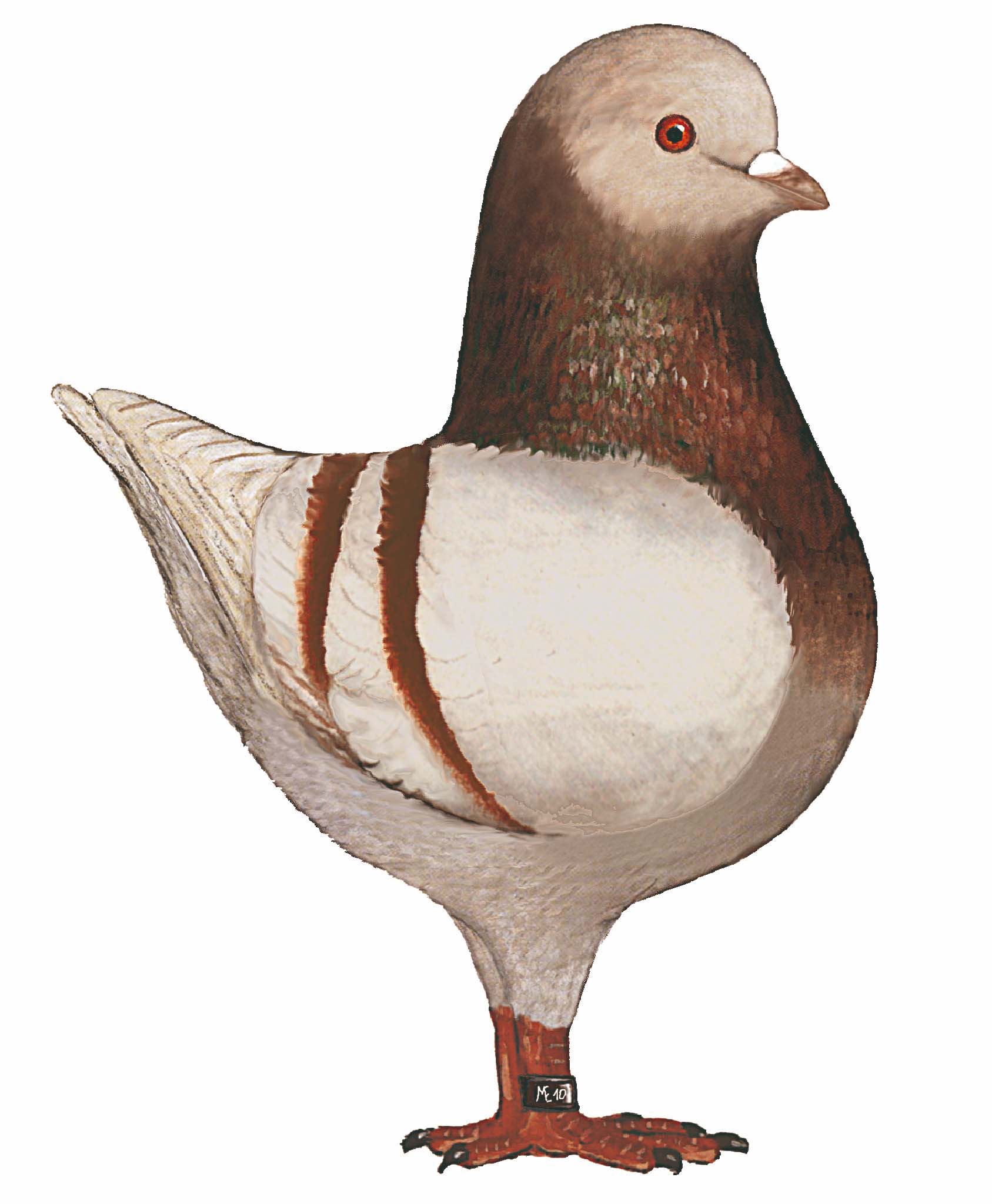 polni sijaj bledo rdeče barve. Po vratu je metalno zelenkasti sijaj. Na krilih sta dve podvezici, ki rahlo zavijata v obliki črke V in se približno 2,5 cm od konca krilnega pokrova na koncu krila skoraj spajata. Temen rep ni dovoljen. Vrat, prsi in podvezice so enako rdeče barve. Rdeče ali rjavkaste pege so dovoljene na krilno letalnem ter repnem perju. Na trtici je zaželena pepelasto siva barva, dovoljena pa je tudi sivo srebrna. |