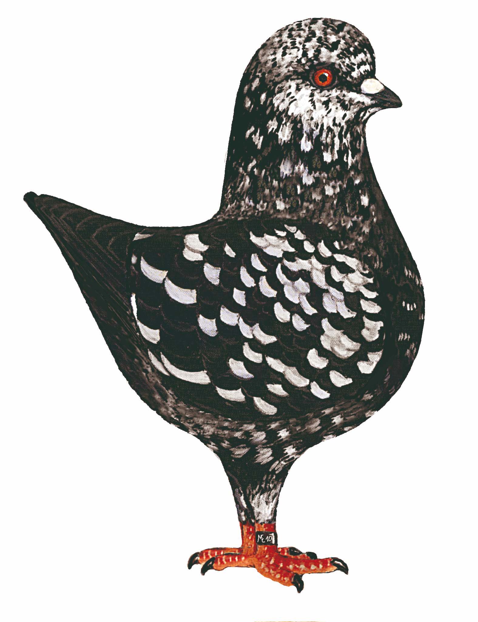 obstojna črna in sijajna, z razkošno barvo perja. Rep in krila so brez bele barve. Belo perje je po krilih, glavi, oz. po telesu. |